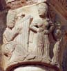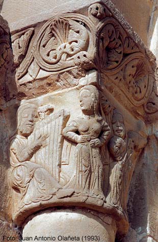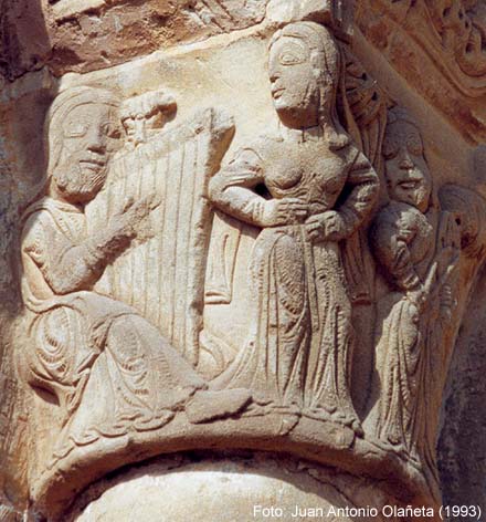 Descripción En la portada sur hay dos capiteles contiguos en los que se representan sendas escenas de danza. En el primero de ellos, una bailarina de pie con las manos en las caderas, situada en el ángulo del capitel, baila al son que tocan dos músicos con un arpa-salterio y una fídula. Considerando que el arpista está en actitud de afinar su instrumento y que la posición de la bailarina bien puede ser de espera podría pensarse que estamos a los momentos previos a la danza. En el otro capitel, un músico, que lleva una vestimenta con capucha, toca un albogue mientras una mujer baila en una posición contorsionada hacía atrás con la manos en la cadera y la melena suelta. Todos los personajes apoyan sus pies sobre el astrágalo del capitel. |
