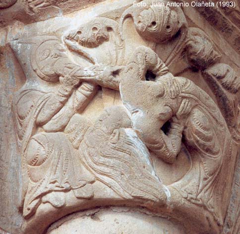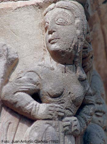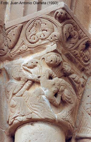 Relaciones Obra del taller del denominado maestro de San Juan de la Peña o maestro de Agüero. Otras obras de este taller son los capiteles de los claustros de San Juan de la Peña y San Pedro el Viejo de Huesca, las portadas de San Nicolas de El Frago, de San Miguel de Biota, de San Felices de Uncastillo, del Salvador de Ejea de los Caballeros, así como un apostolado en la portada de Santa María la Real de Sangüesa. La escena de danza con una bailarina contorsionada es uno de los temas predominantes de este taller. |