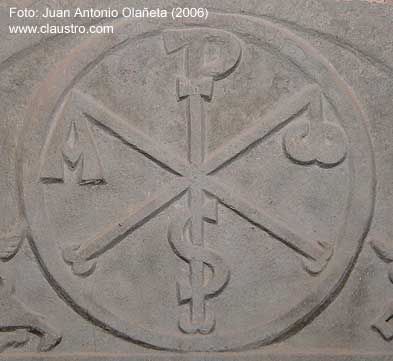 | Descripción Es una pieza circular y trinitaria que ocupa buena parte de la superficie del tímpano en la que se encuentra. Tiene seis brazos de listel rematados de forma ancorada. Está escoltado por un león alado y un grifo. La letra alfa es grande y con puente de pico. La omega está pinjante y tiene forma de llave cerrada. La letra P tiene pestaña, vano pequeño en forma de gota, debajo del cual se encuentra una corta tilde horizontal de cruz. La S es alargada. |